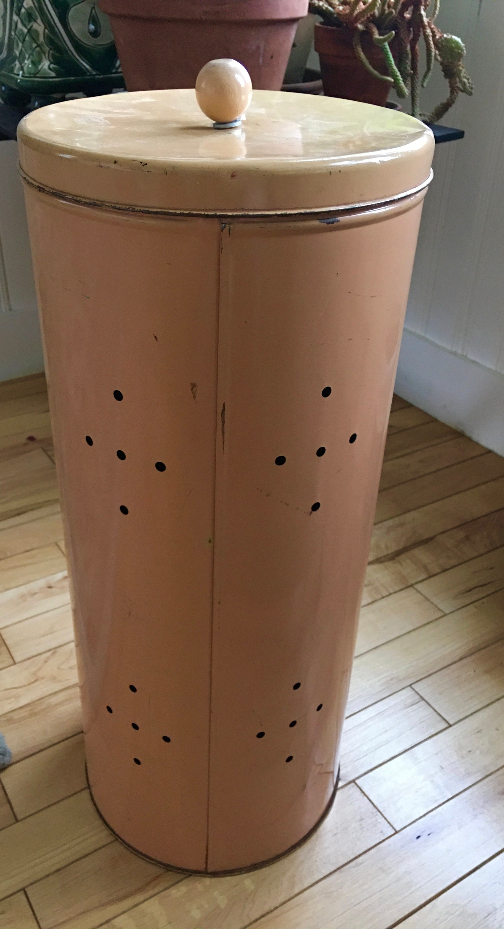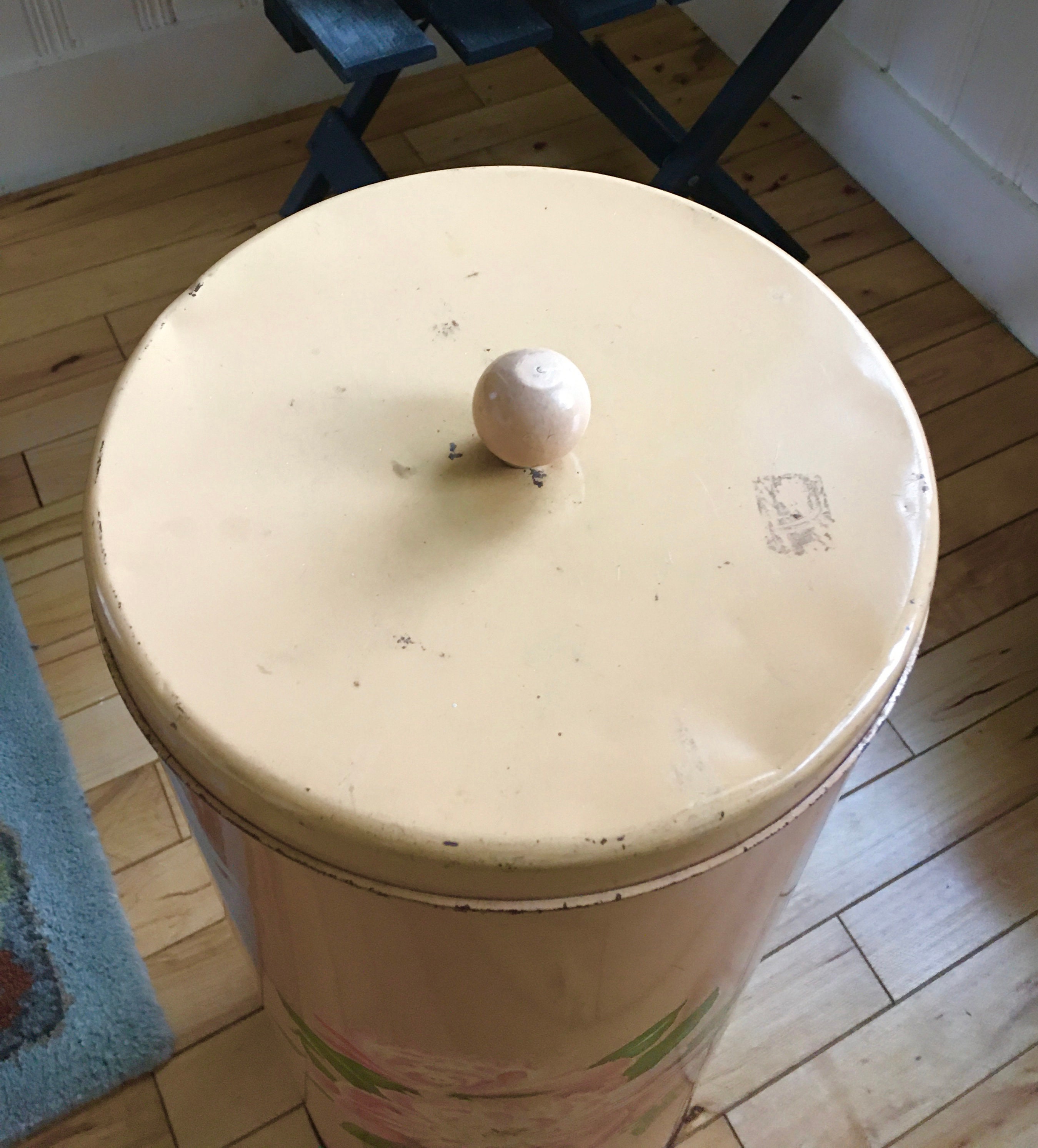 1940 S Metal Cylinder Laundry Hamper Peach Coral Decoware Tall Basket Lid Wood Knob Peony Flower Decal Vintage Laundry Basket