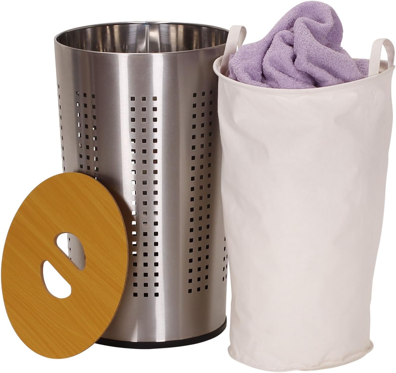 Amazon Com Household Essentials 7081 1 Round Metal Laundry Hamper Removable Liner Bag And Wood Lid Stainless Steel Home Kitchen