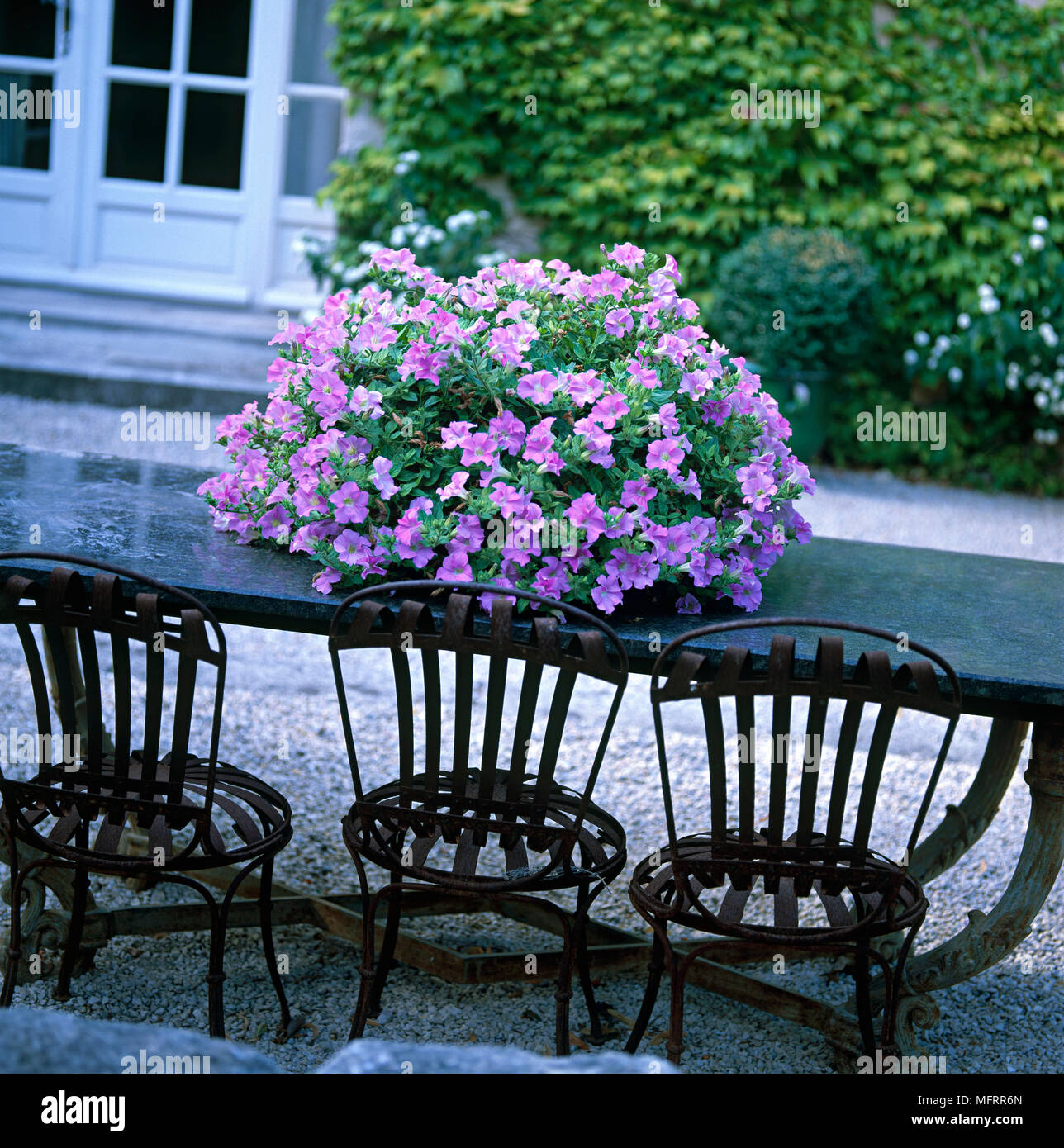 Outdoor Stone Dining Table With Metal Chairs And Blooming Petunia