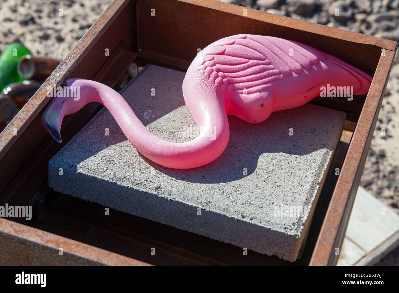 A Pink Flamingo Ornament In A Metal Box Stock Photo Alamy