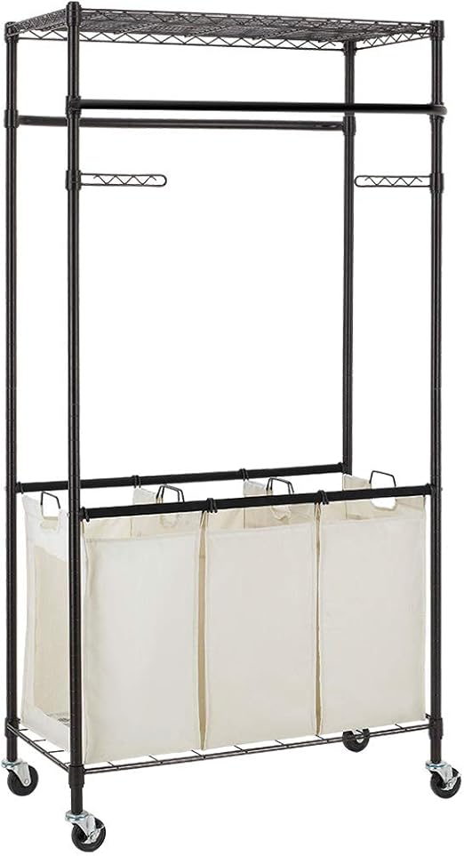Amazon Com 3 Compartment Laundry Sorter Hamper Heavy Duty Clothes Rack Hanging Rolling Laundry Cart With Wheels Rod Garment Rack Double Metal Height Adjustable Shelves Commercial Grade For Laundry Room Bronze Home Kitchen