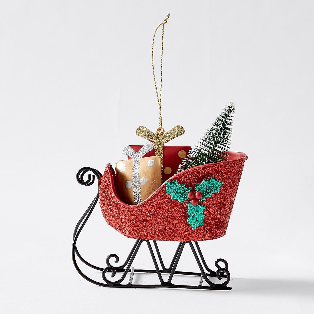 Christmas Ornament Glittered Creamy Metal Santa Sleigh With