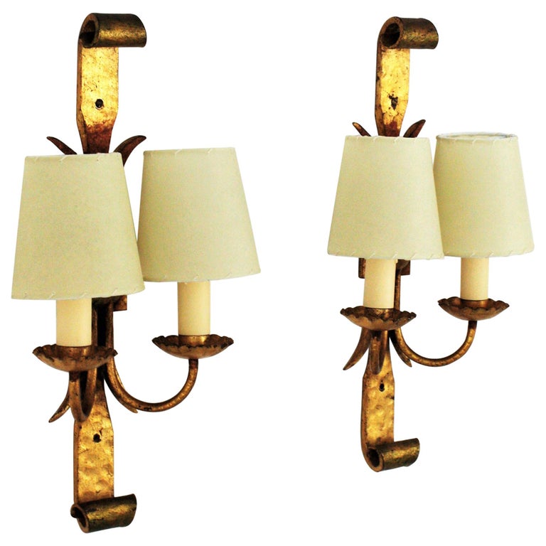 Spanish 1940s Two Arm Wrought Gilt Iron Wall Sconces With Scroll Endings Pair For Sale At 1stdibs