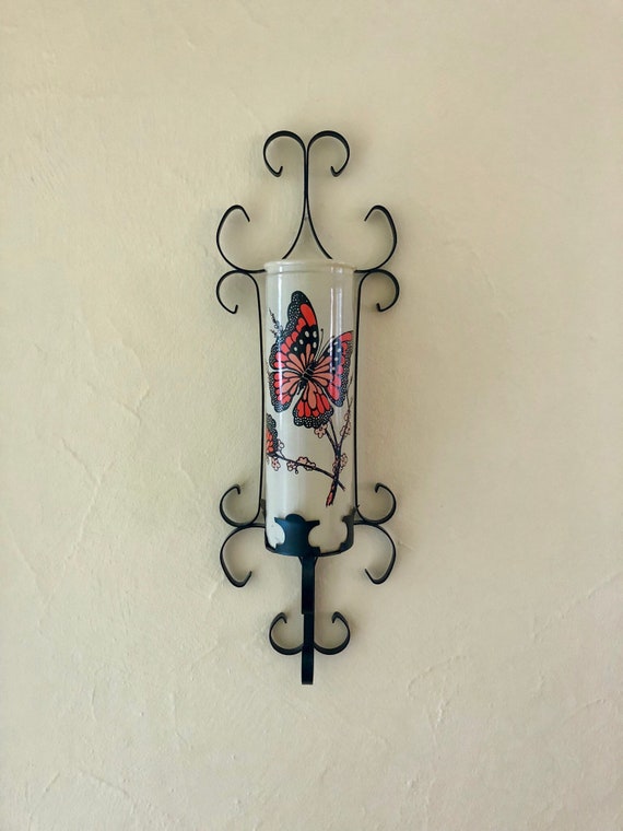 Vintage Black Metal Scroll Wall Sconce With Butterfly Glass Etsy