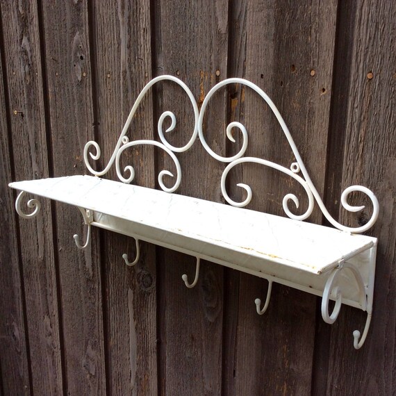 Vintage White Metal Wall Shelf With 5 Hooks White Bathroom Etsy
