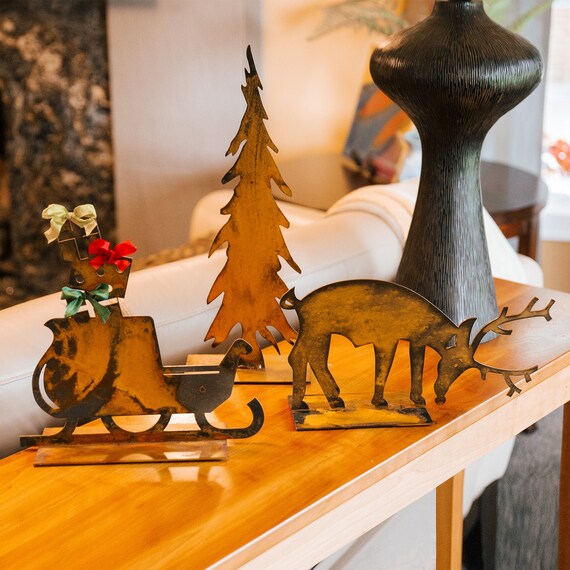 Mid Century Metal Sleigh And Santa Christmas Decor Centerpiece Excellent Condition By Virgoago Centerpiece Decorations Elf Centerpieces Christmas Decorations