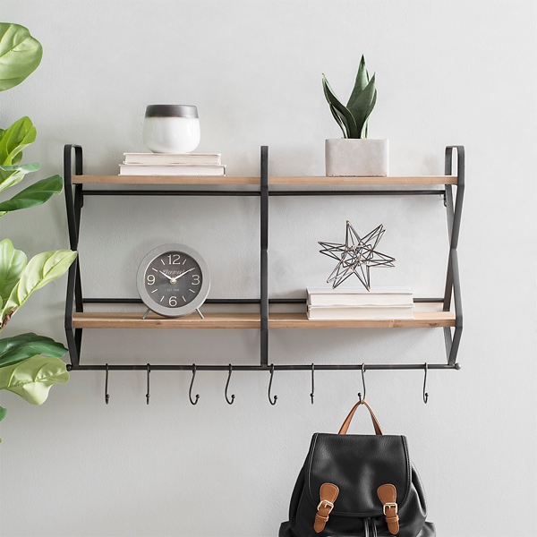 Wooden And Metal Double Wall Shelf With Hooks Kirklands