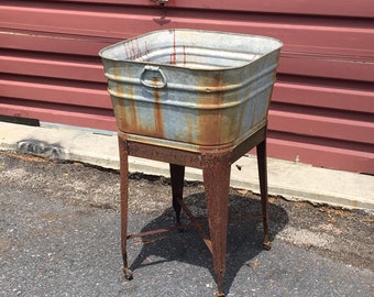 Vintage Old Galvanized Metal Wash Tub On Stand Plant Stand Garden