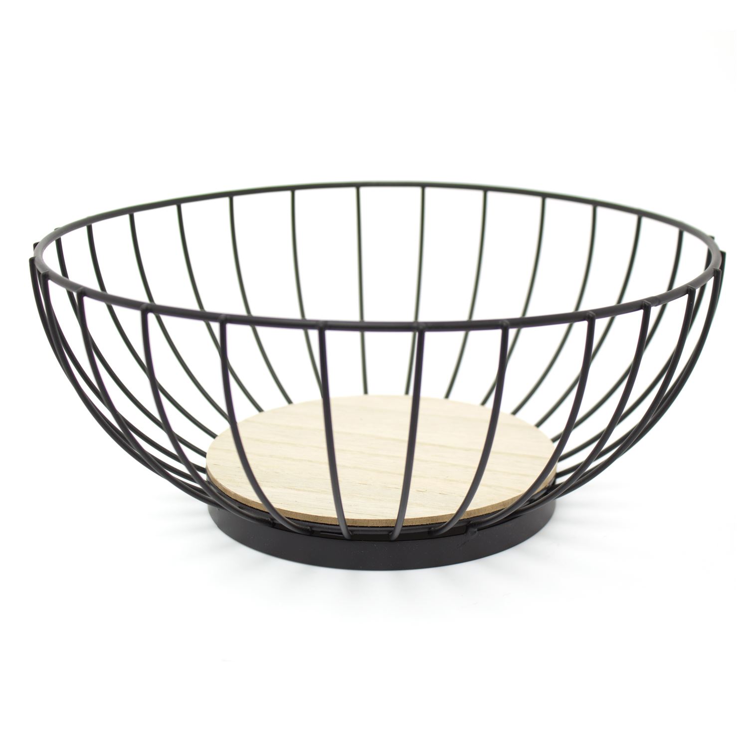 Black Metal Wire Fruit Basket With Wooden Base Kitchen Storage