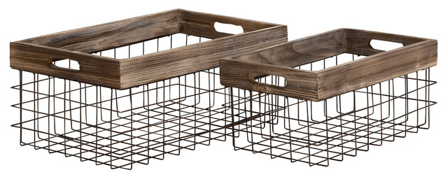 Stonebriar Farmhouse Metal Wire Cage And Wood Baskets Set Of 2