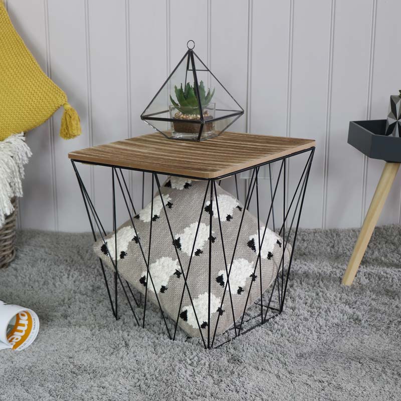 Black Metal Square Basket Wooden Top Table Flora Furniture