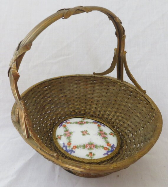 19th C Porcelain Bottom Gilt Metal Woven Basket Etsy