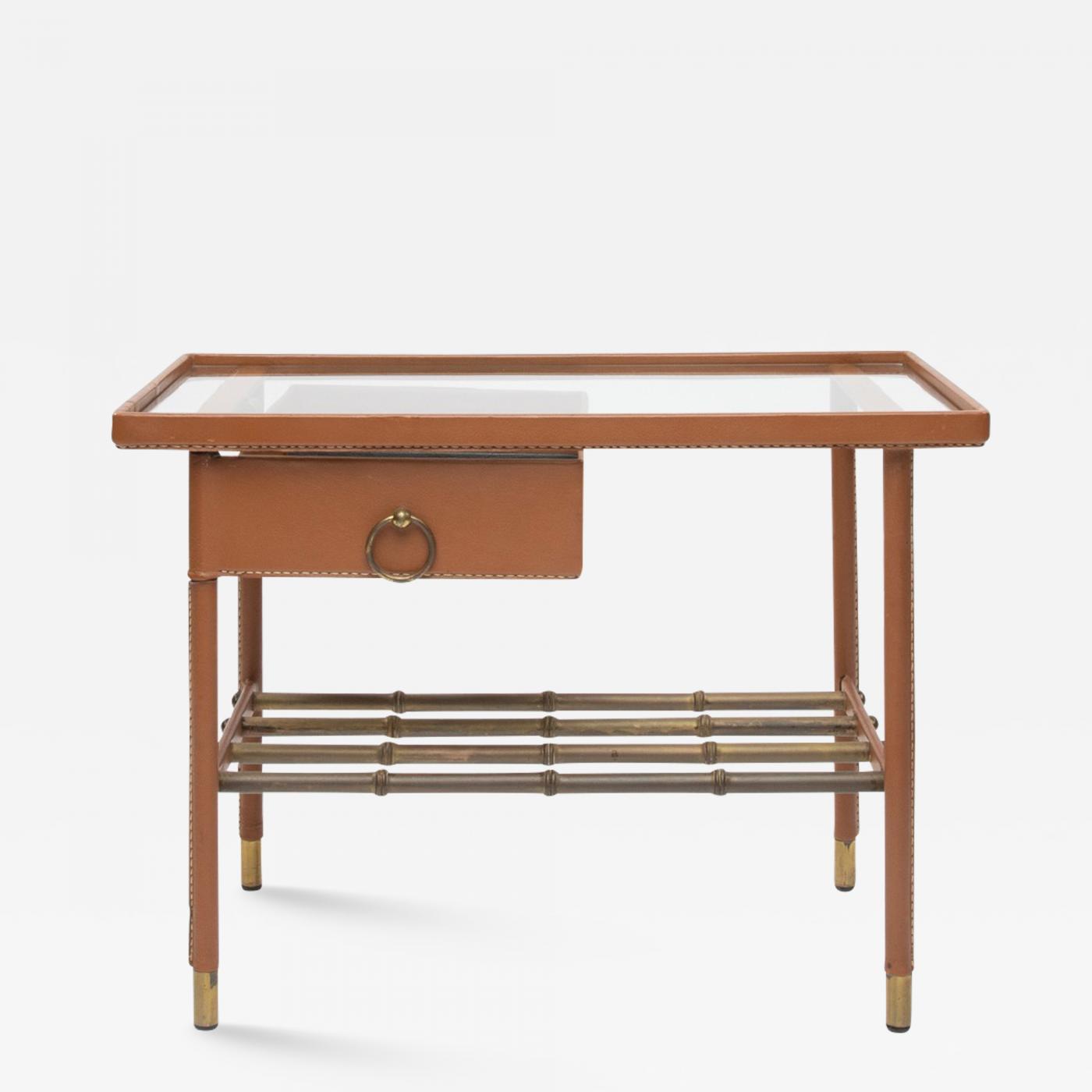 French Midcentury Cognac Leather Glass Side Table With Drawer