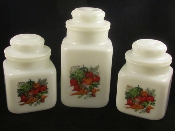 Set Of 3 Milk Glass Canisters Spice Of Life Glasbake Vegetable Etsy