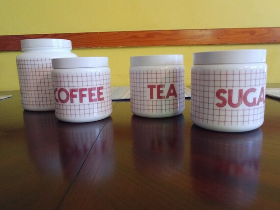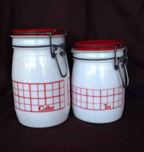 Vintage Red White Plaid 2 Piece Milk Glass Canister Set Tea And