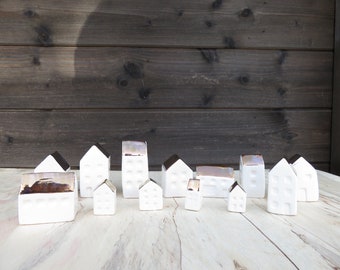 Small White Ceramic Houses Set Of 2 Miniature Buildings Handmade