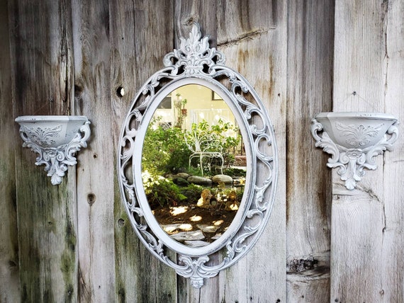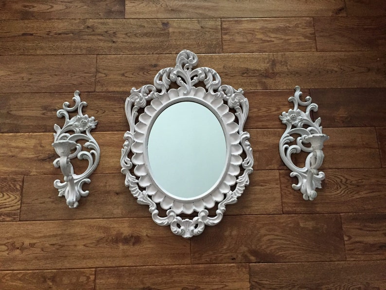 Ornate Mirror And Sconce Set White And Grey Distressed Etsy