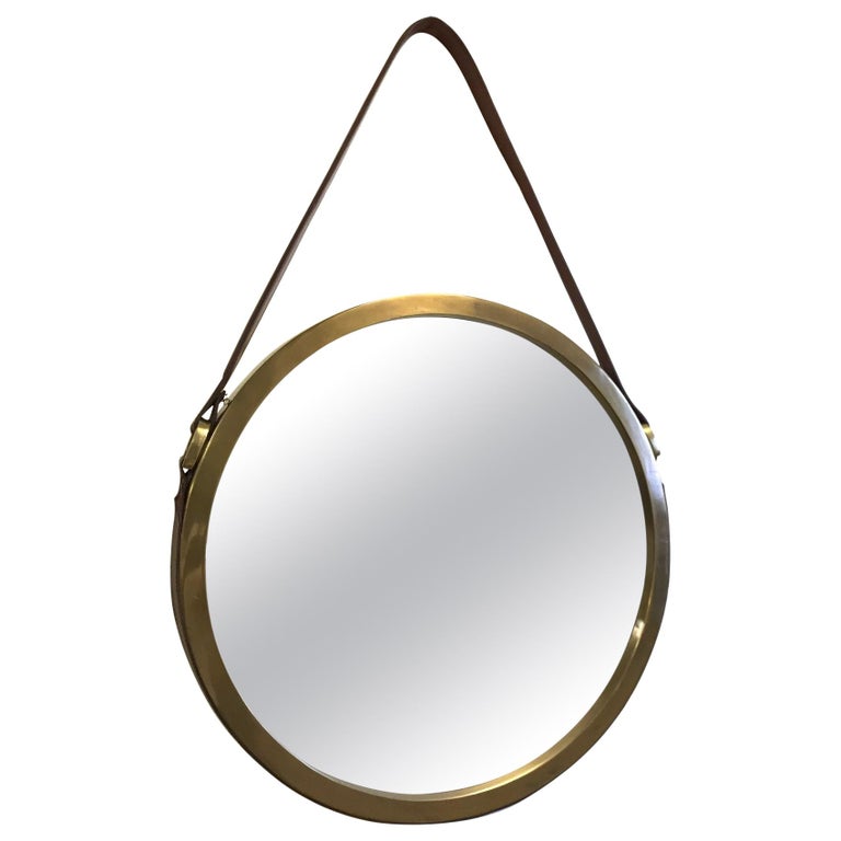 Brass And Leather Strap Mirror Style Of Jacques Adnet For Sale At