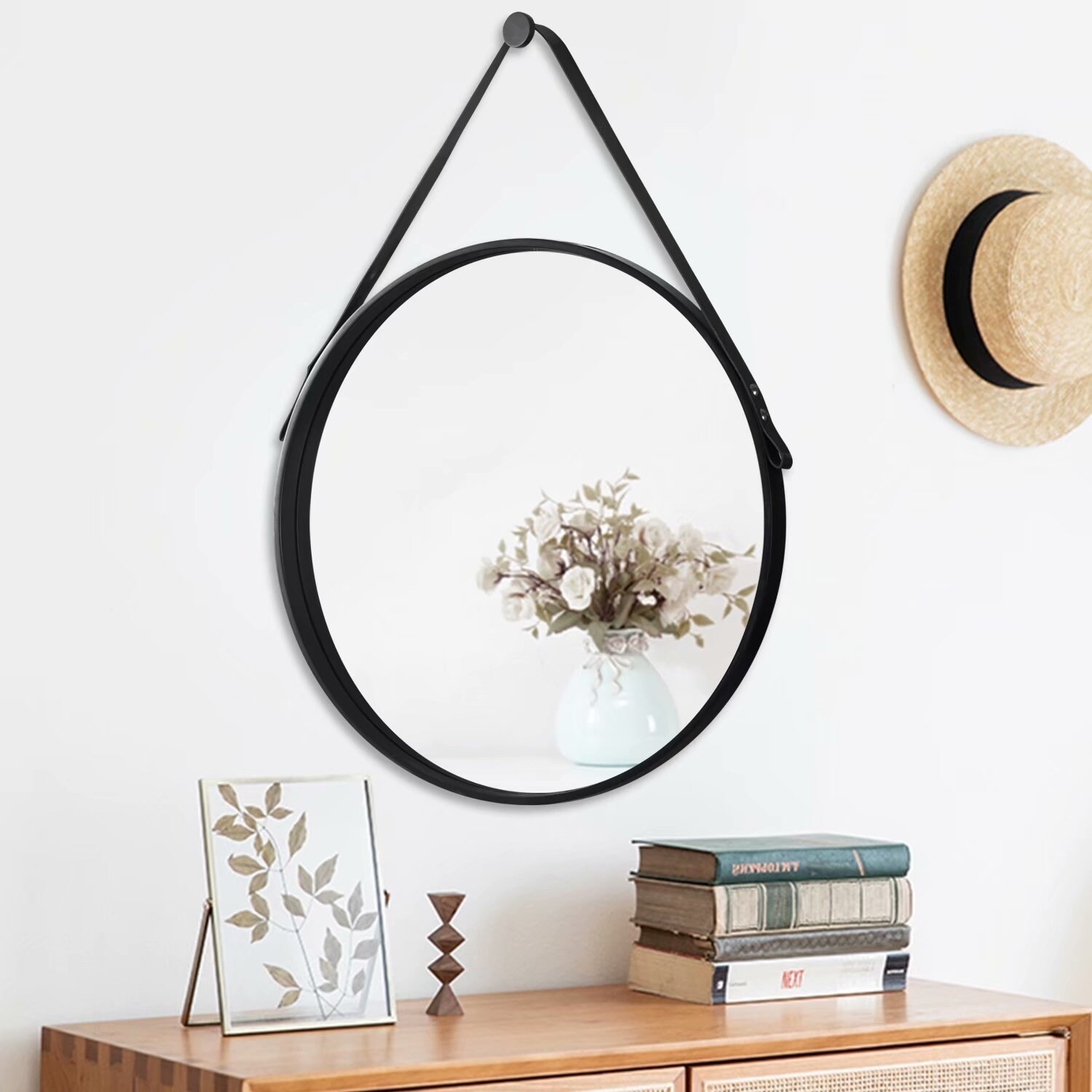 Decorative Bathroom Round Hanging Strap Leather Wall Mirror With