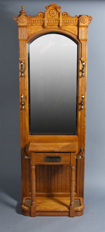 Antique Oak Entry Hall Tree Incorporate Mirror Facade Into Coat