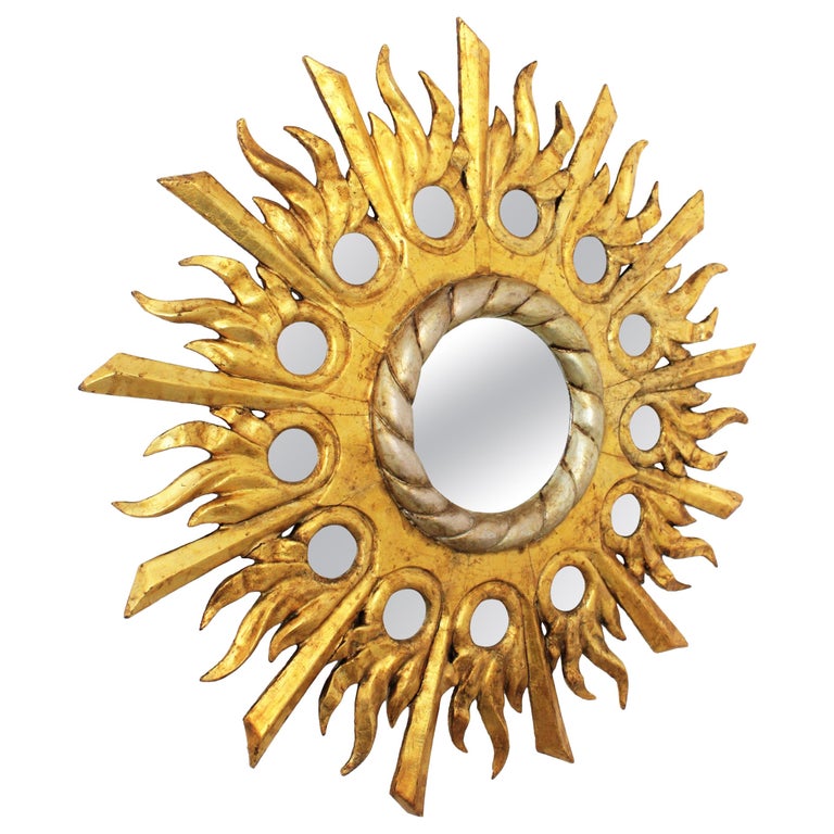 Gold Giltwood Sunburst Mirror With Silver Leaf Accents And