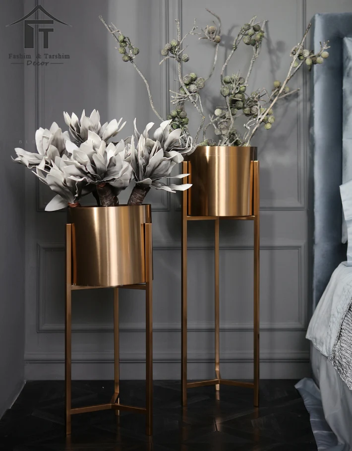 Large Modern Round Iron Gold Metal Floor Flower Vase Green Plant