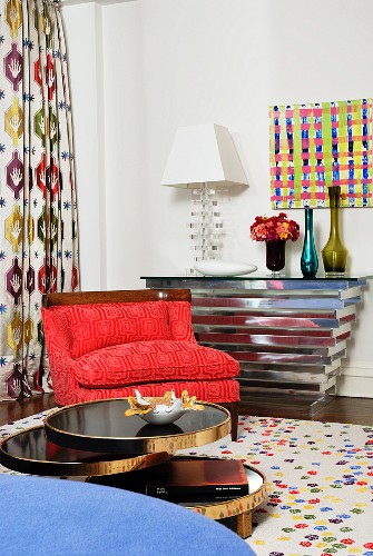Entryway With Red Console Table And Tan Ottomans Hgtv