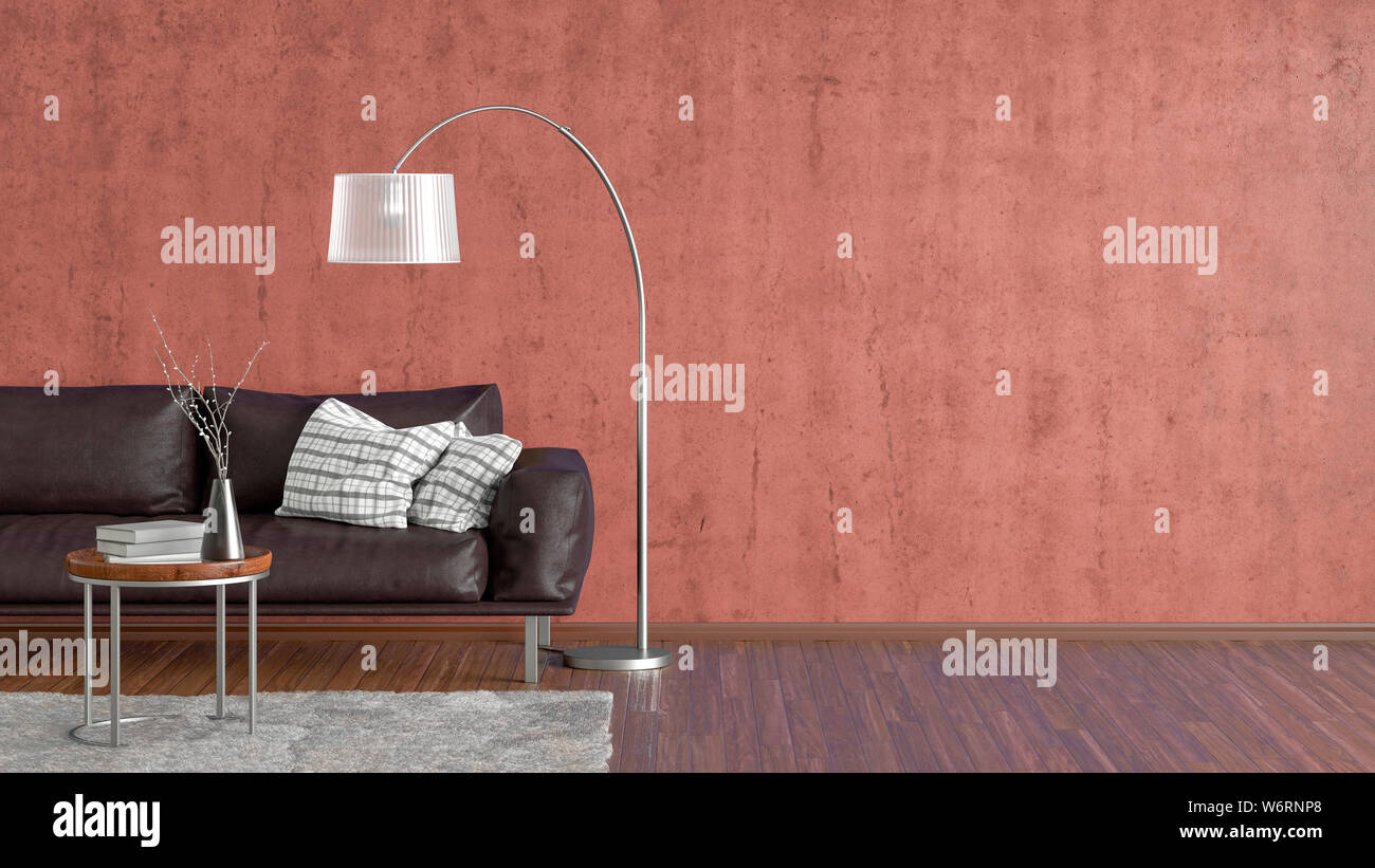 Interior Of Modern Living Room With Red Concrete Wall And Wooden