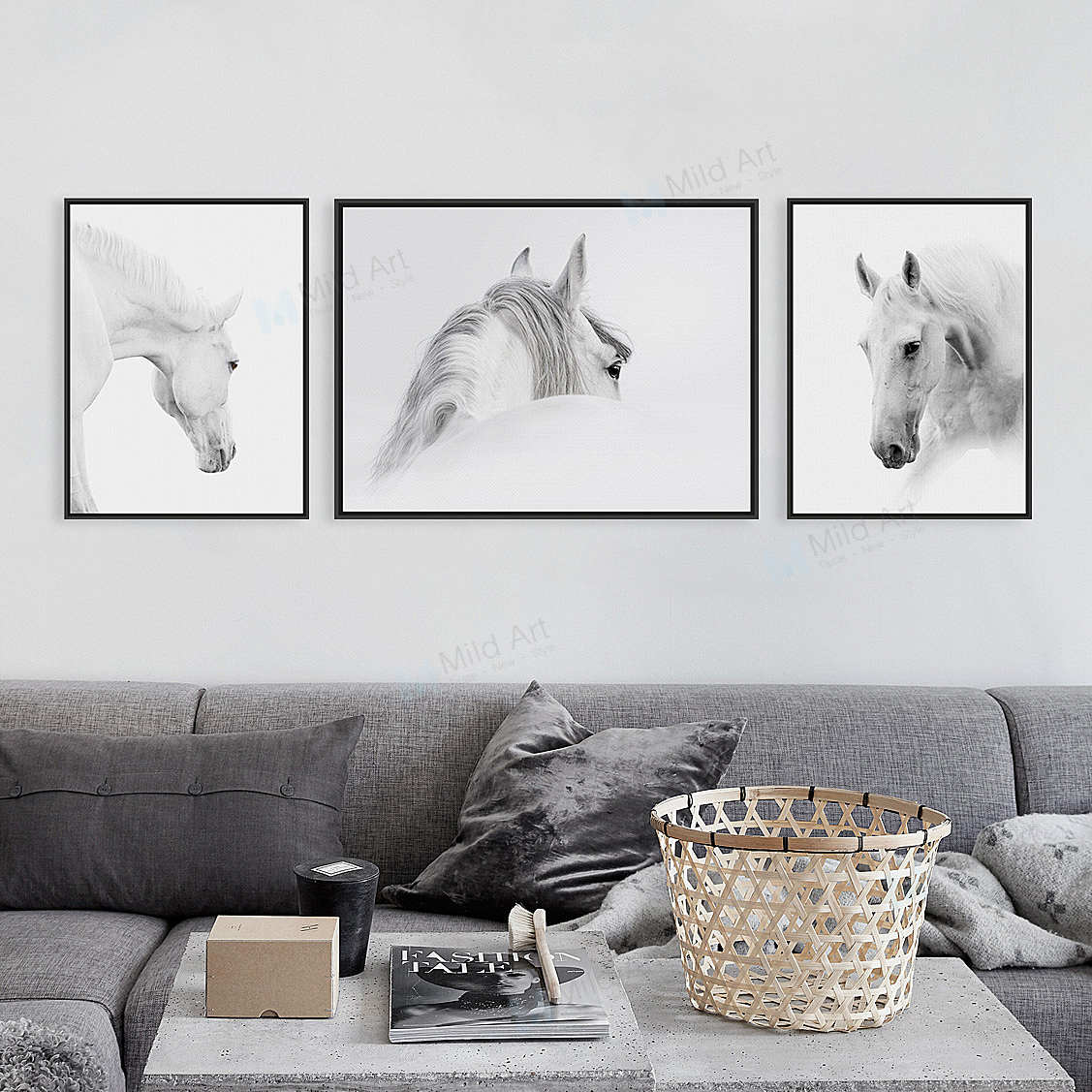Triptych Modern White Horse Head Framed Canvas Painting Rectangle Framed Canvas Painting Mild Art Taste Style
