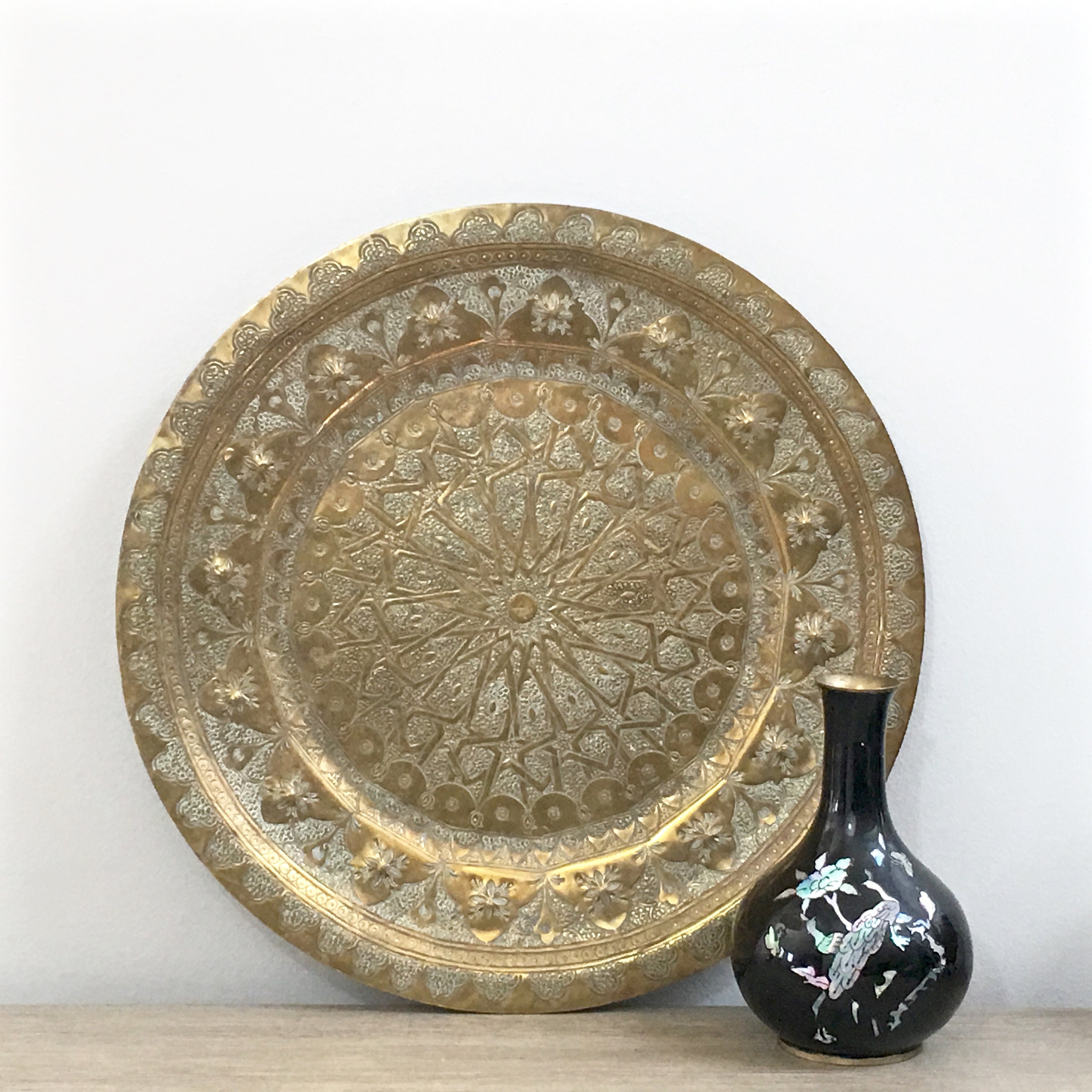 Rare Vintage Moroccan Etched Brass Round Tray Table Mother Of