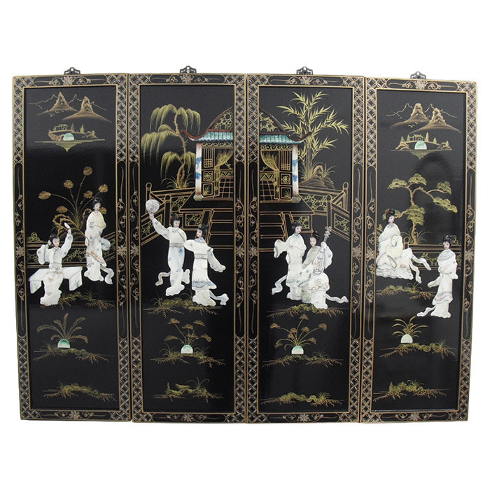 4 Vintage Asian Lacquer Wood Mother Of Pearl Wall Decor Panels Set