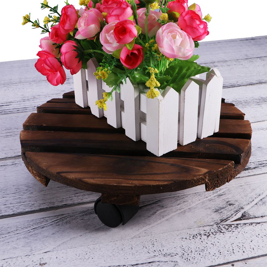 Practical Rolling Wheeled Round Wooden Planter Caddy Movable Plant