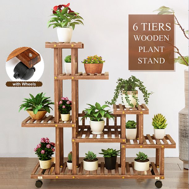 6 Tier With Wheels Pot Flower Wooden Plant Stand Movable Shelf
