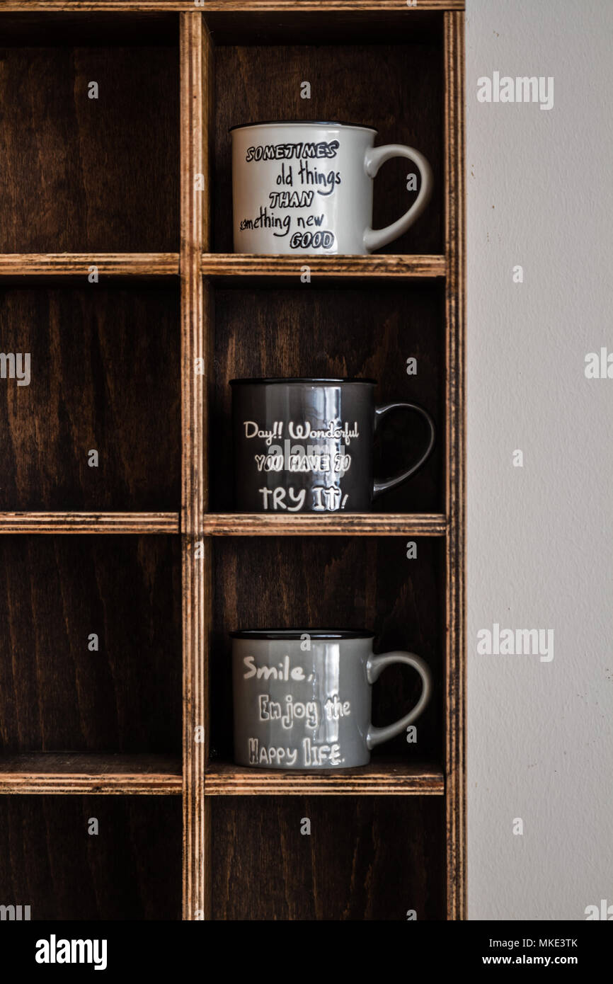 Ceramic Coffee Mugs On Handmade Wooden Rustic Wall Shelf Stock