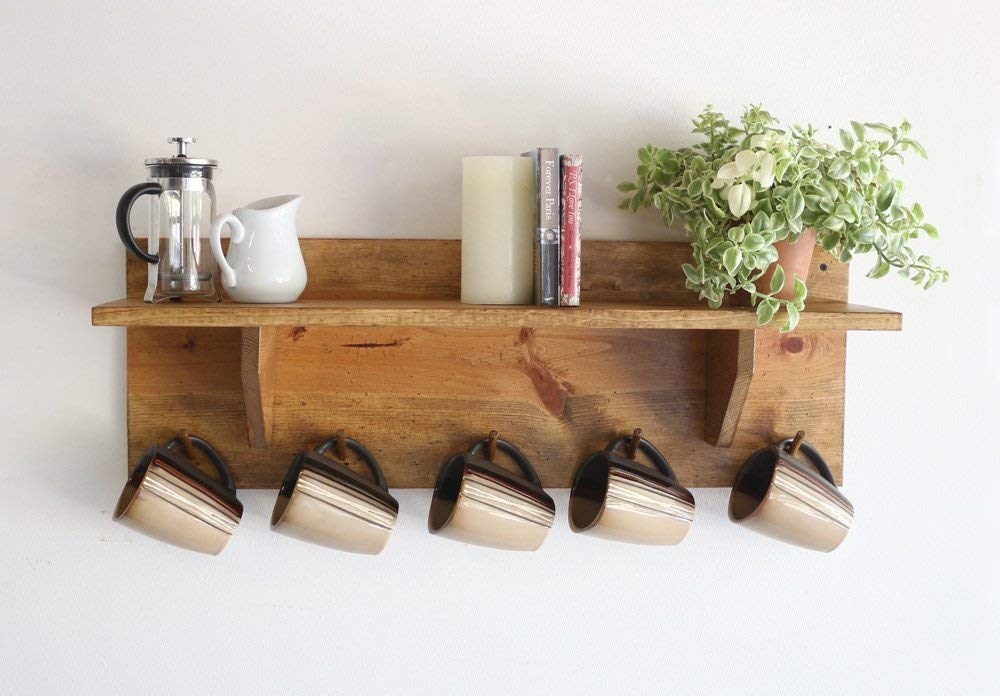 Amazon Com Rustic Pine Coffee Mug Rack With Shelf Wall Mounted