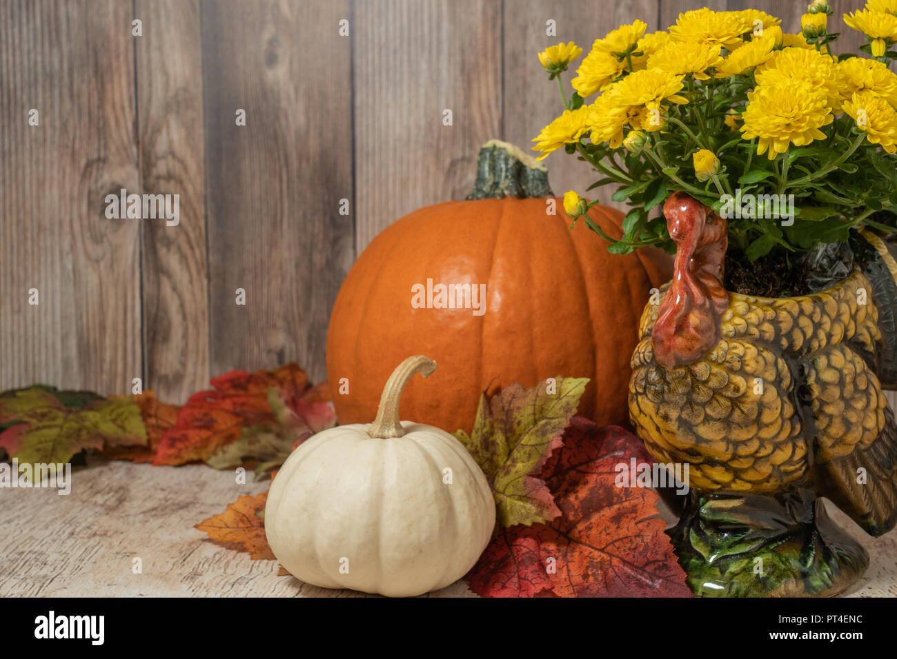 Thanksgiving Decor With Pumpkins And Chrysanthemums In A Turkey