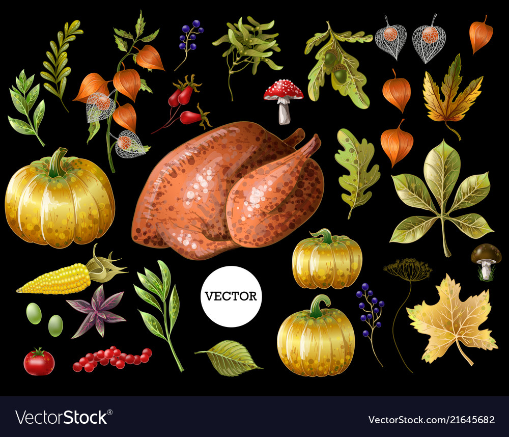 Set Of Thanksgiving Decor And Food Such As Turkey Vector Image