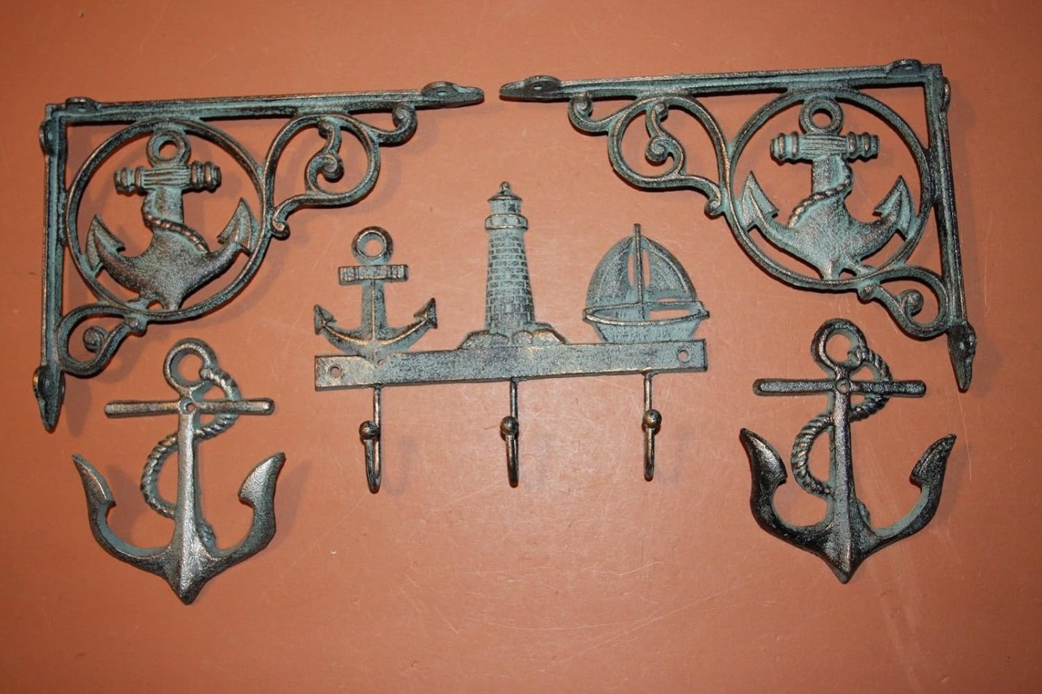 5 Piece Blue Nautical Wall Hook Cast Iron Kitchen Rack Bag Key