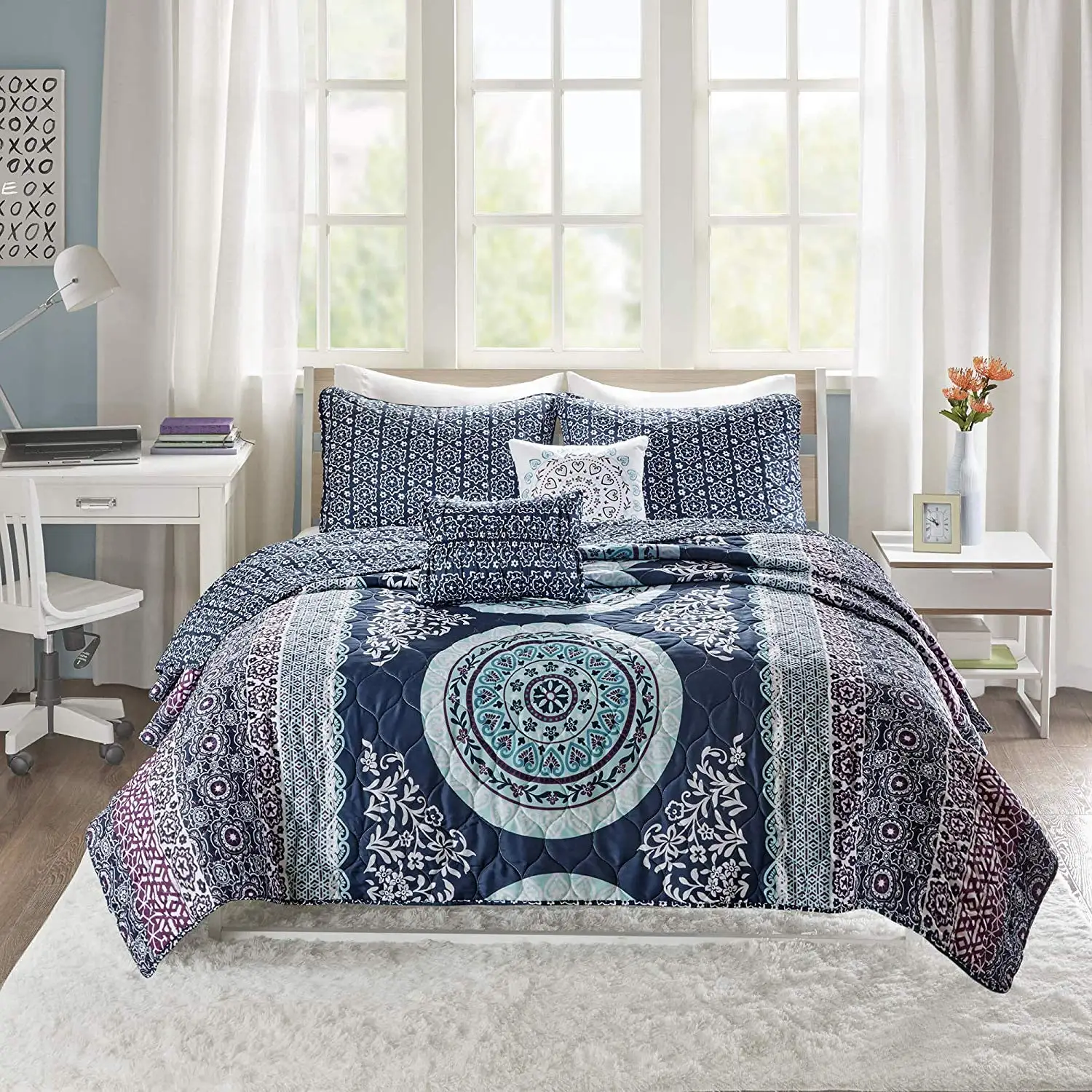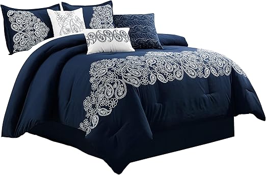 7 Piece Navy Blue White Paisley Ornamental Print Pattern Cozy
