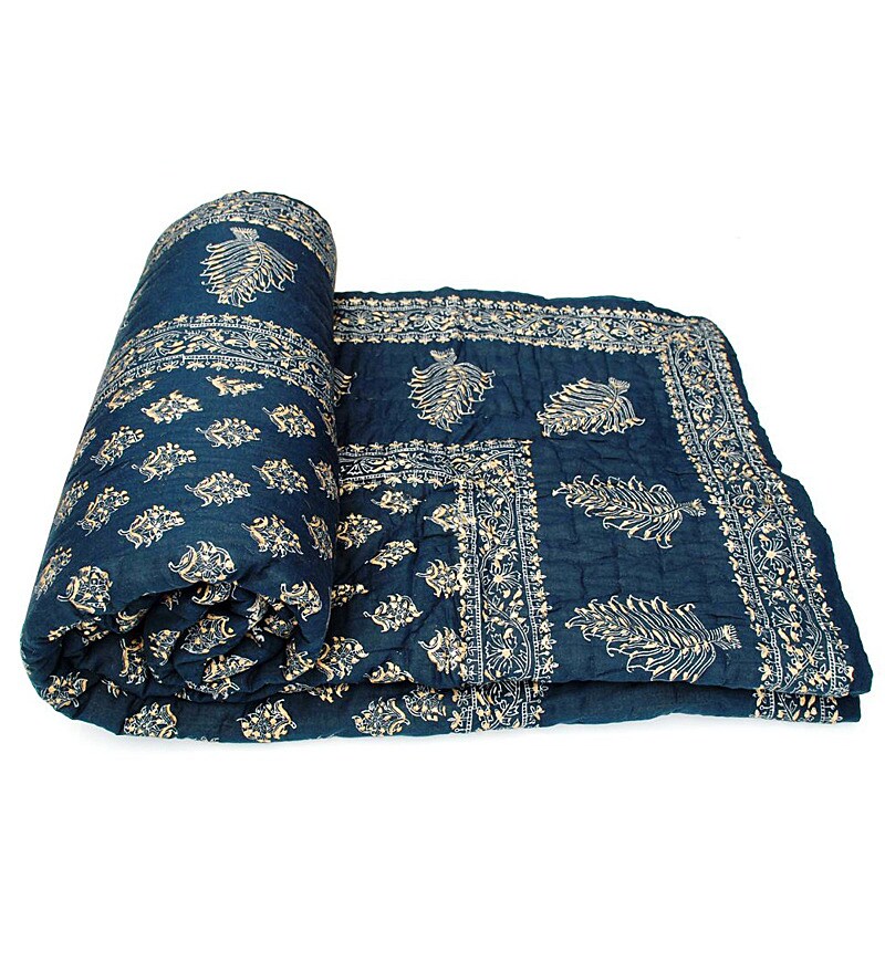 Buy Energetic Navy Blue Colored Jaipuri Quilt Floral Golden Print