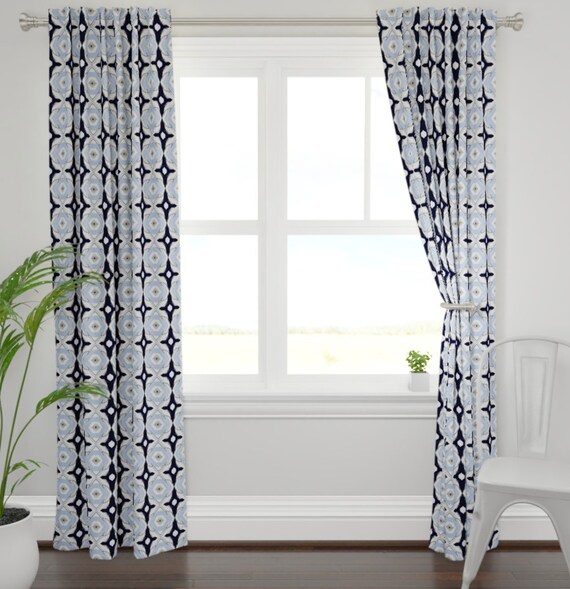 Navy Curtains Medallion Curtains Navy Blue White Tan Curtains Etsy