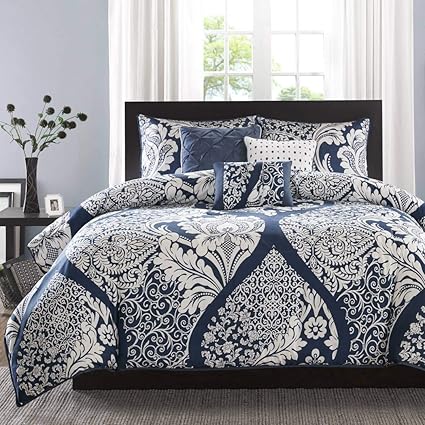 7 Piece Navy Blue White Paisley Ornamental Print Pattern Cozy