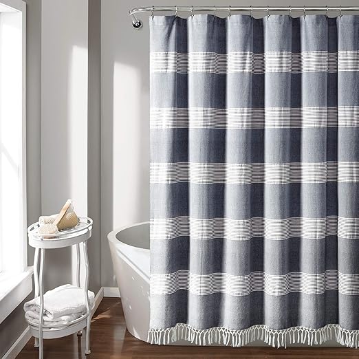 Cotton Fringe Stripe Shower Curtain Navy White 72 X72