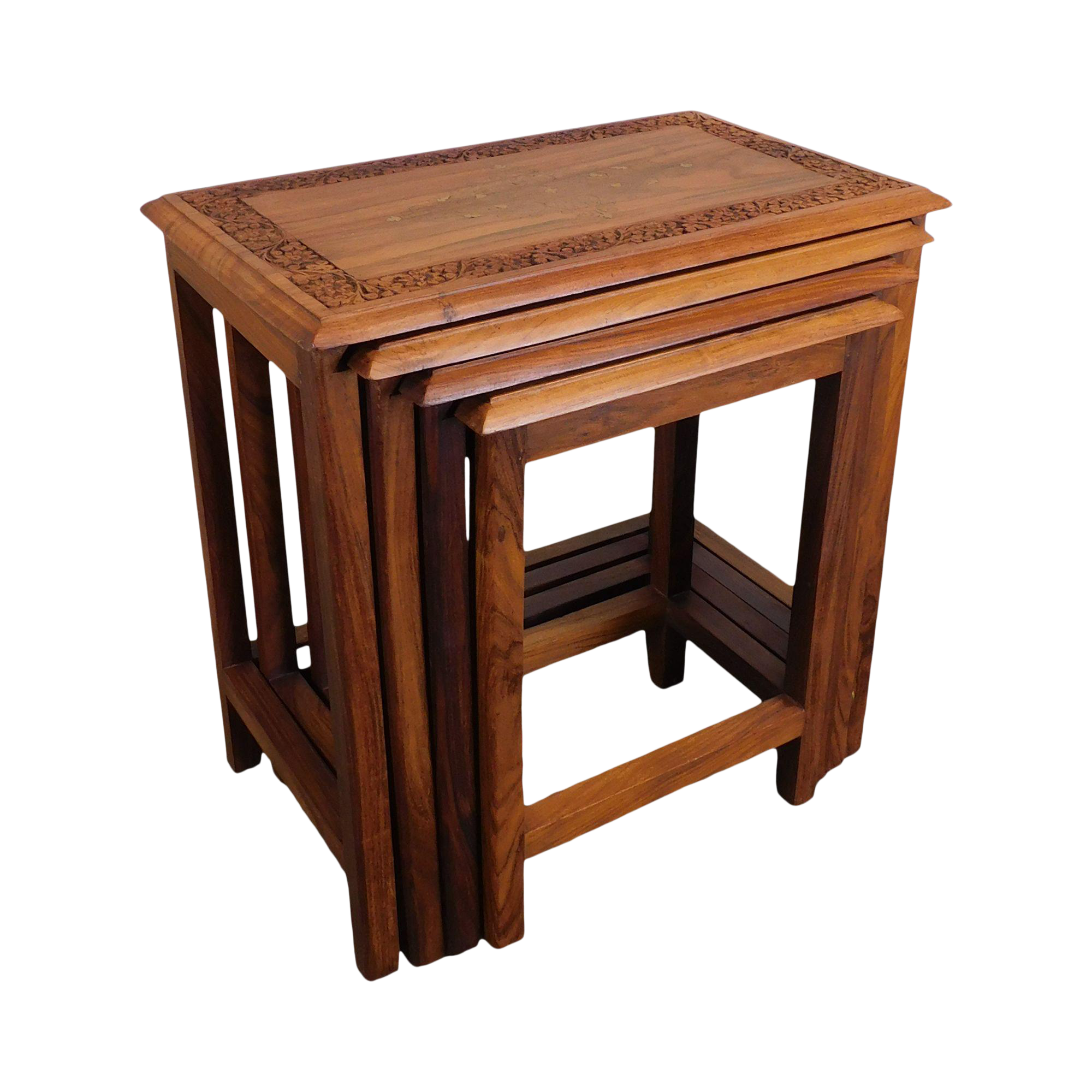 Anglo Indian Solid Teak Wood Nesting Tables With Brass Inlay
