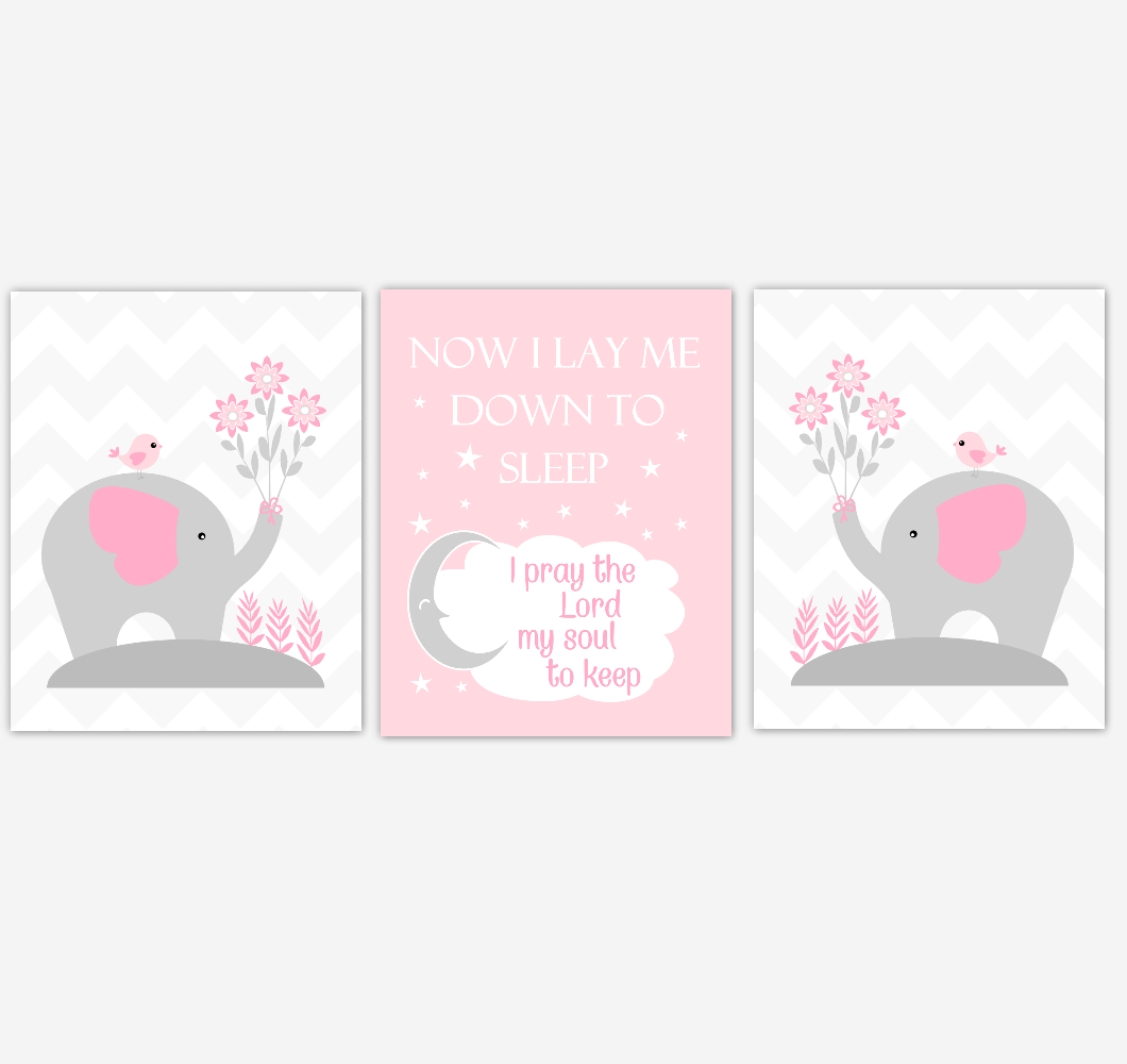 Pink Baby Girl Nursery Art Elephants Now I Lay Me Down To Sleep